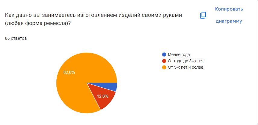 Более активно на опрос откликнулись мастера-ремесленники, которые занимаются изготовлением изделий более 3-х лет. Более половины опрошенных уже регулярно создают изделия и выставляют их на продажу.
