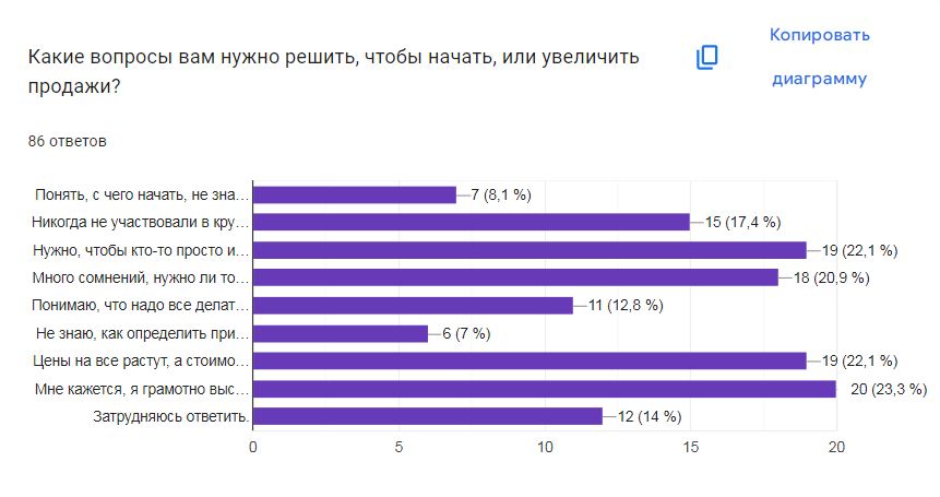 При этом, только 23,3% отметили «мне кажется, я грамотно выстраиваю свои продажи, но есть желание увеличить и понять дополнительные ресурсы», 22.1% хотят, чтобы кто-то просто и практично объяснил, как решить вопрос о продажах, а 20,9% испытывают много сомнений, нужно ли то, что они делают, готов ли кто-то платить деньги за их изделия.