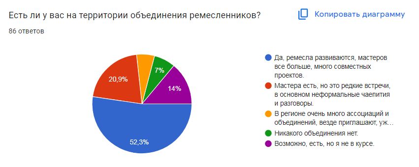 Участники опроса из Екатеринбурга, Сысерти и Верхней Пышмы практически все отметили, что ремесла на их территориях развиваются, мастеров все больше, много совместных проектов (52,3% ответов), а вот мастера с малых территорий выбрали ответ «мастера есть, но это редкие встречи, в основном неформальные чаепития и разговоры» (20,9%), 14% на вопрос об объединениях говорят, «возможно есть, но я не в курсе», 7% уверены, что никакого объединения нет. Это говорит о необходимости обучать малые территории вопросам создания и развития ремесленных сообществ.