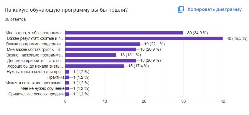 Чему и при каких условиях еще хотят учиться ремесленники? Опрос показал ожидания от обучающих программ: для 46,5% важен результат: сжатые и практические знания, которые можно использовать в работе, для 34,9% важно, чтобы программа была короткой, интенсивной, и никуда не надо бы ехать/или очень просто добираться, 22,1% отметили важность программы поддержки после обучения, сопровождение, ответы на вопросы, у многих есть опыт, когда на занятии все понятно, а потом проявляются непонятные детали.